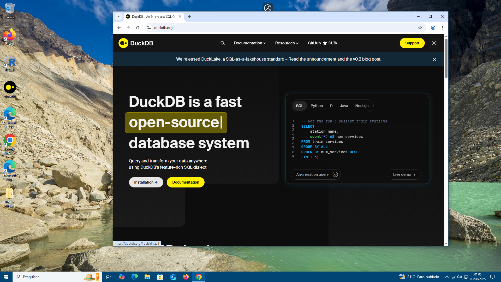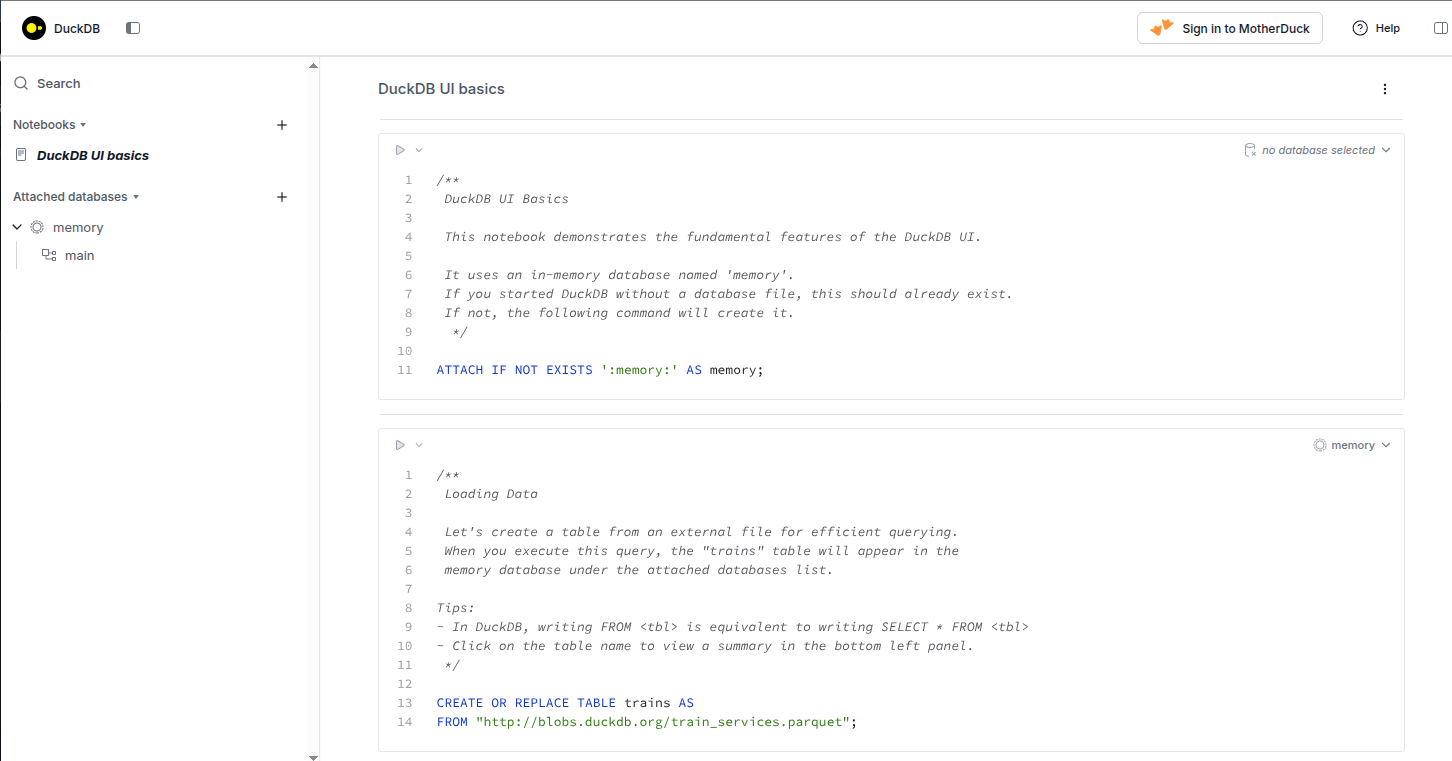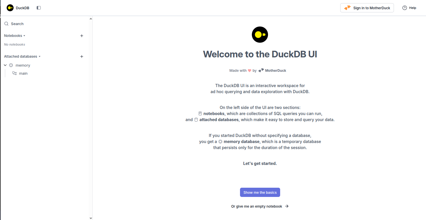 Clicando no botão azul “show me the basics” podemos testar o duckdb!