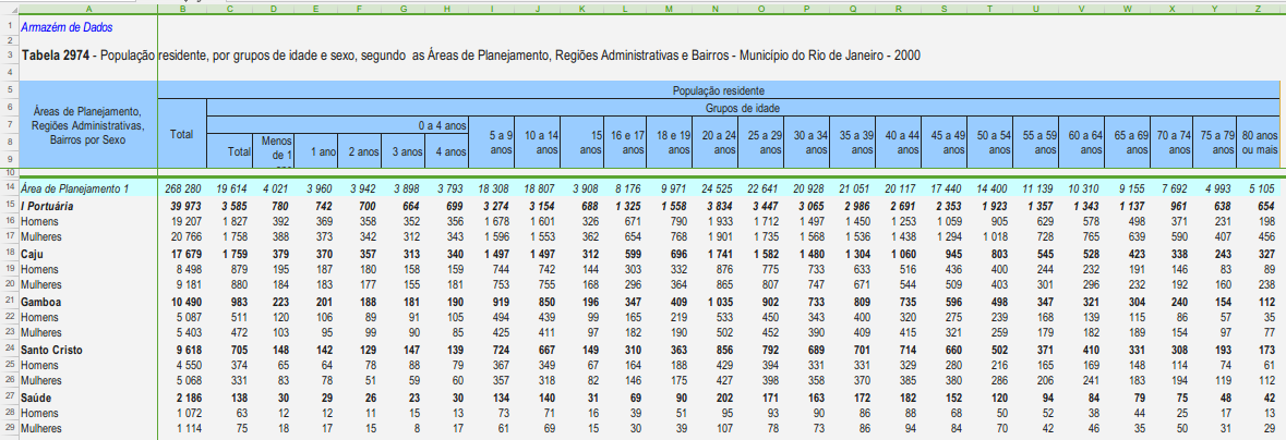 - Cada linha representa coisas diferentes, como uma AP, uma região administrativa, um bairro, e sexo