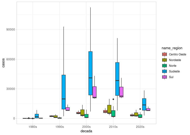 pode parecer mais complexa à primeira vista. Porém, após nos familiarizarmos com ela, conseguimos, em poucas linhas, criar gráficos sofisticados, compostos por múltiplas camadas e com excelente qualidade visual. Com ggplot2