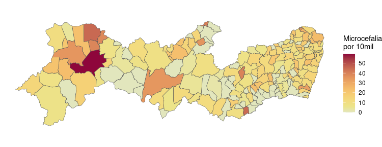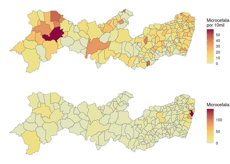 Agora, vamos fazer o mapa usando número de casos de microcefalia, e ver se a distribuição espacial muda. Vamos colocar os dois mapas na mesma figura usando a função ggarrange()