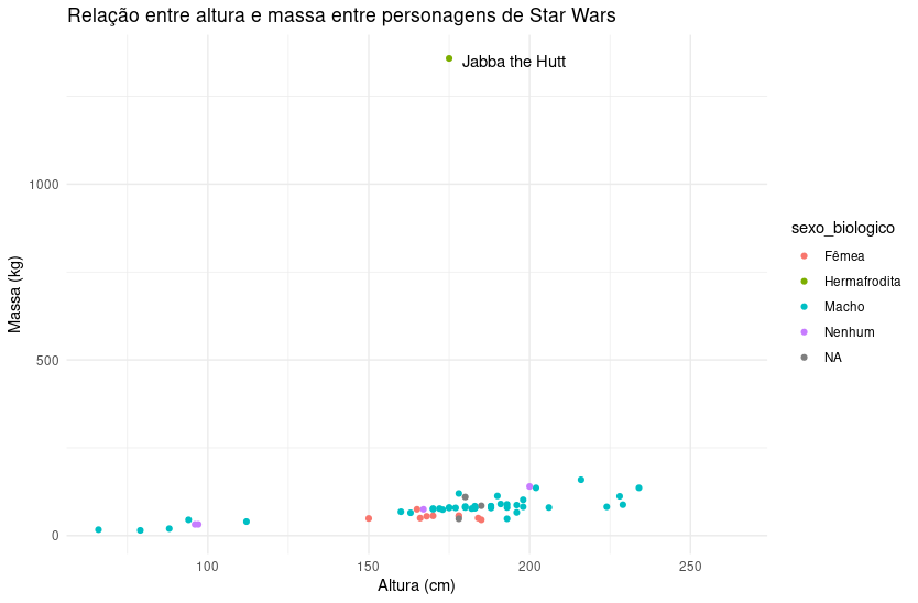 adicionamos uma anotação com o nome do personagem no ponto outlier. Além disso, utilizamos o tema theme_minimal()