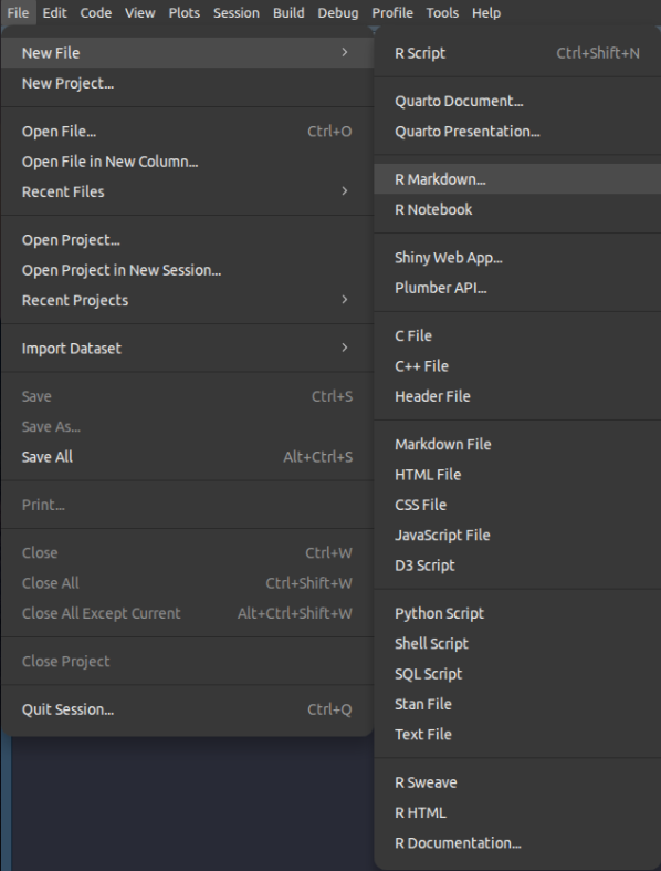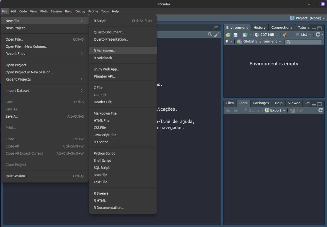 Após iniciar o Rstudio clique na opção file em seguida new file e, por fim, no menu lateral a opção Rmarkdown