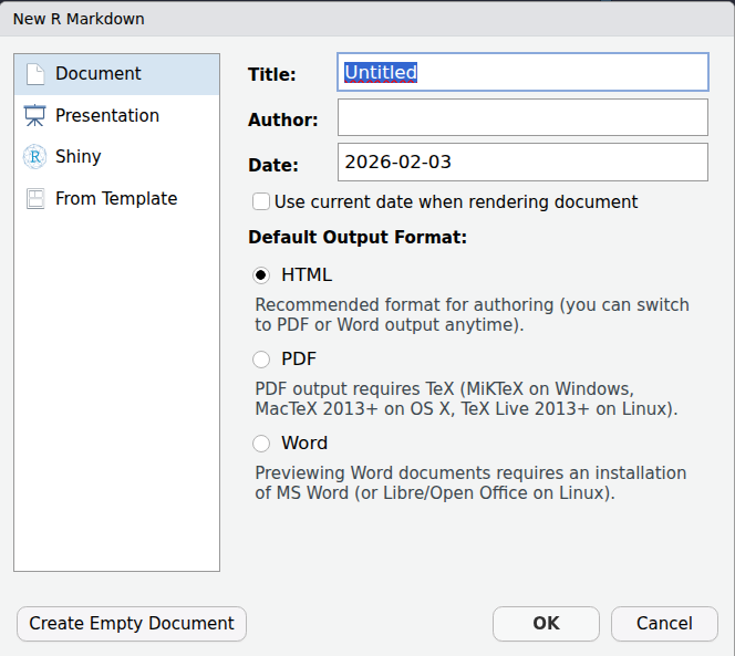 Apos selecionar Rmarkdown o seguinte menu vai aparecer