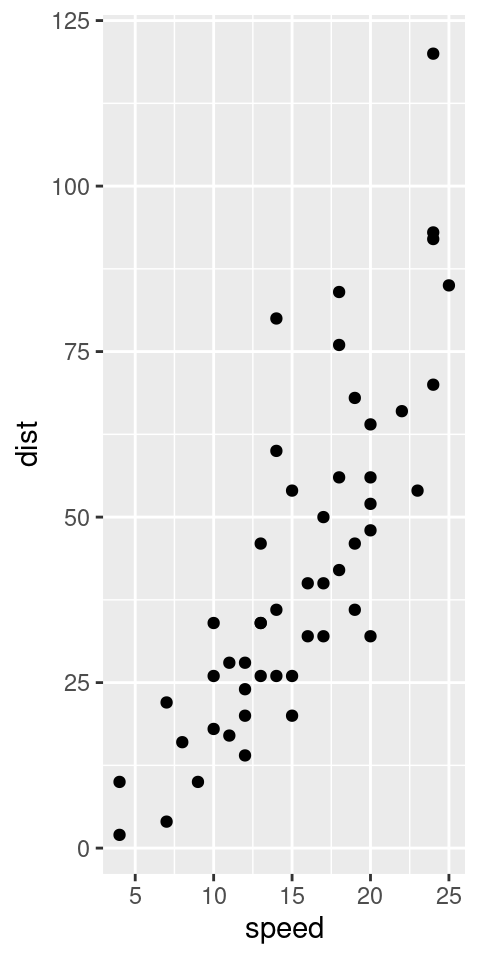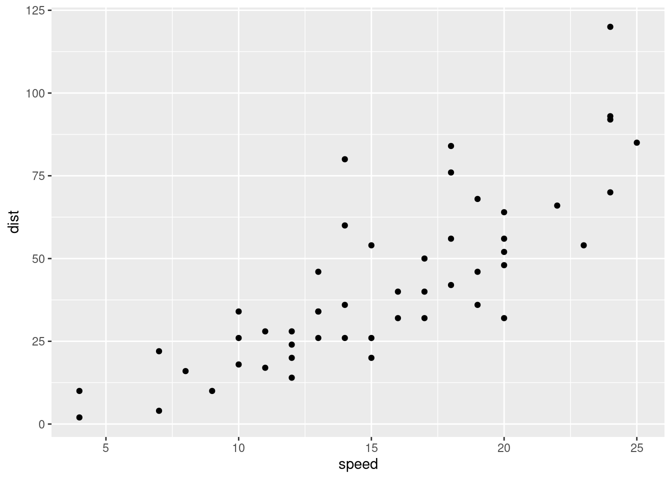 ggplot(cars, aes(speed, dist)) + geom_point()