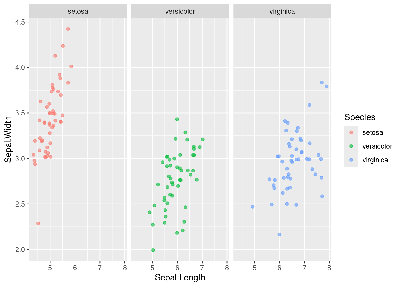 ggplot(iris, aes(x = Sepal.Length, y = Sepal.Width,color=Species)) +
